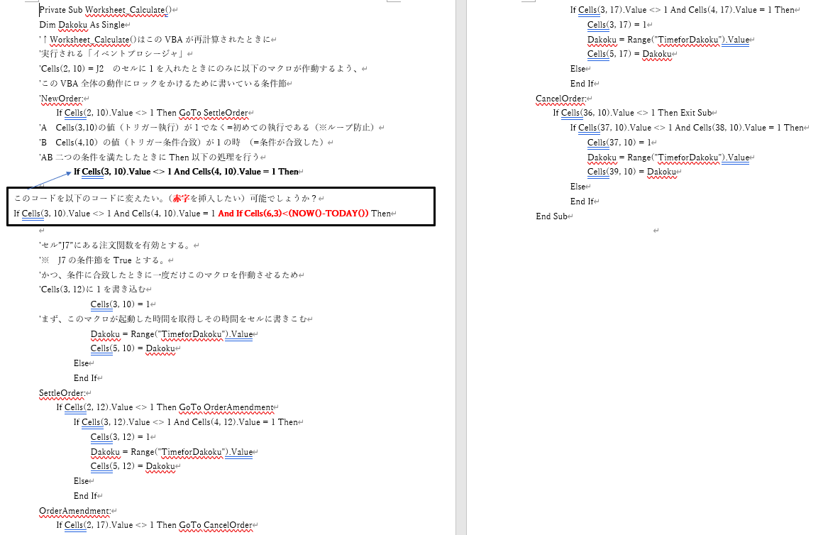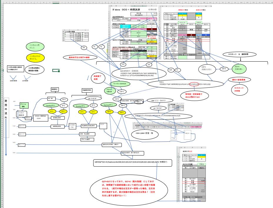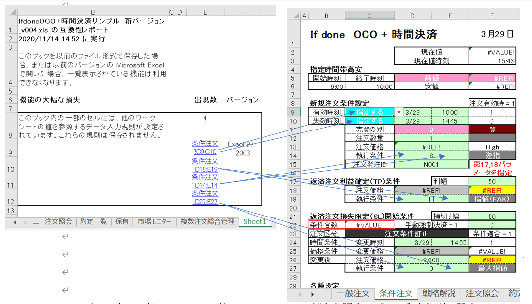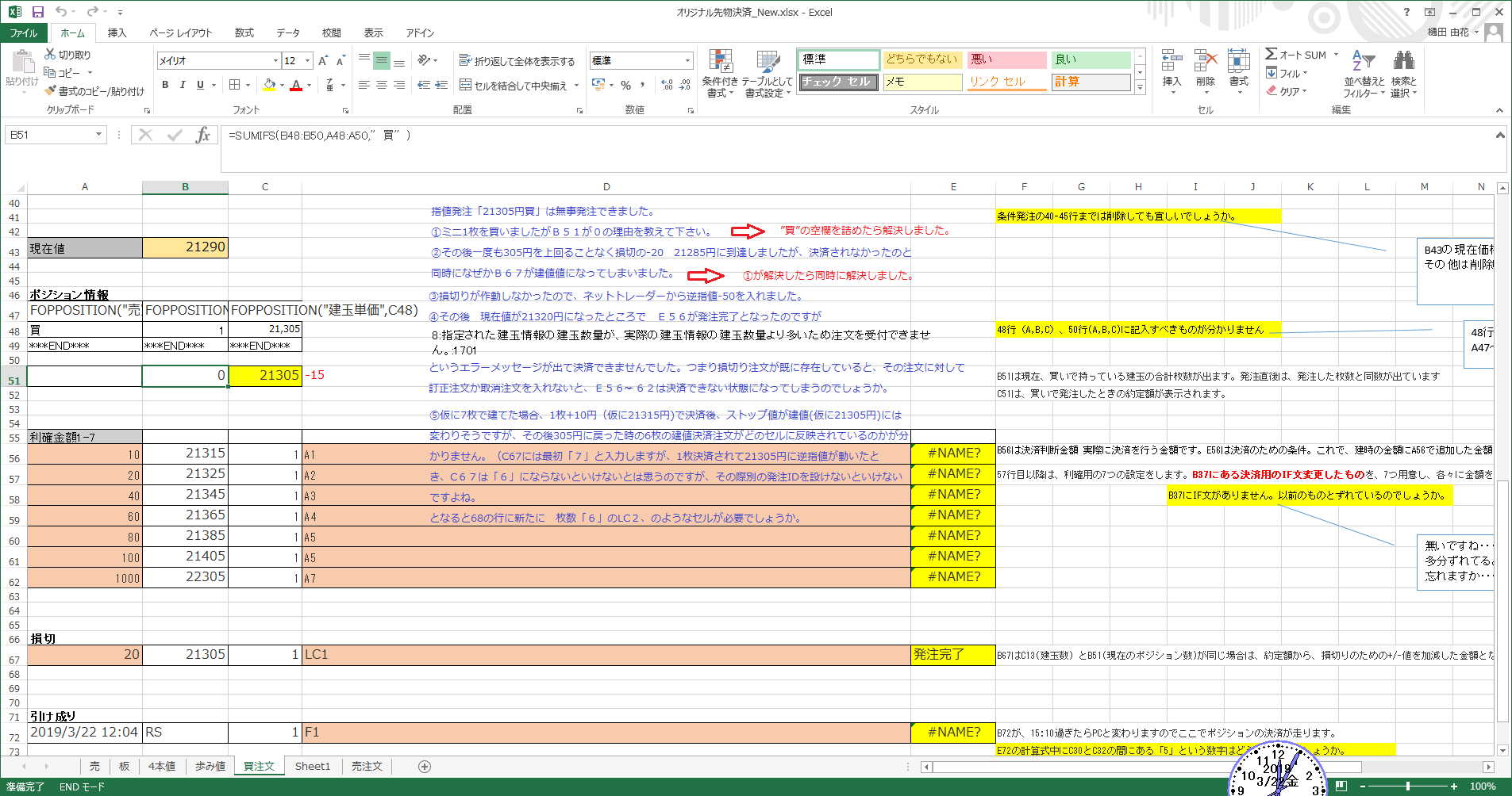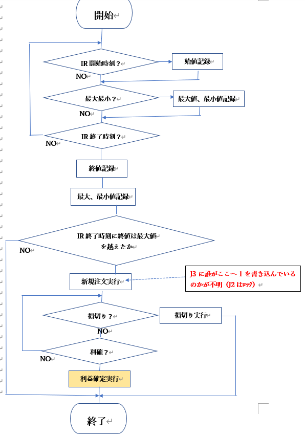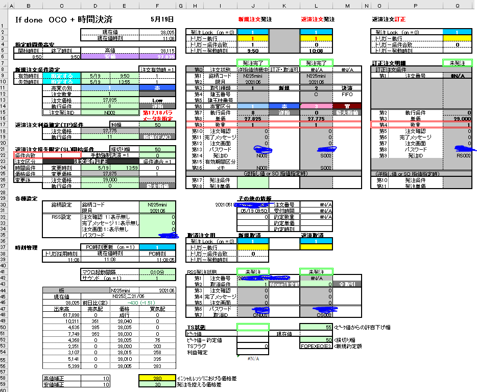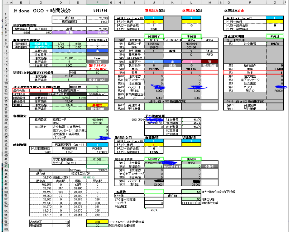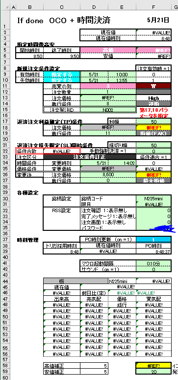 大野様 ところで了解しました。大変ありがとうございました。特に利益を求める関数は助かりました。 早速ですが、次の質問です。本日朝08:45ごろファイルを起動しましたところ、すぐに発注OK状態になってしまいました。おかしいなあ、イニシャルレンジを09:00~10:00にしたはずだが、、と思い、マクロを調べると、確かにイニシャルレンジは考慮されていない様でした。そこでイニシャルレンジの条件を加えるように変更しようと思います。添付資料に示しました様に And If Cells(6,3)<(NOW()-TODAY())を追加しようとしております。これで良いかどうかご教授いただけますれば幸いです。