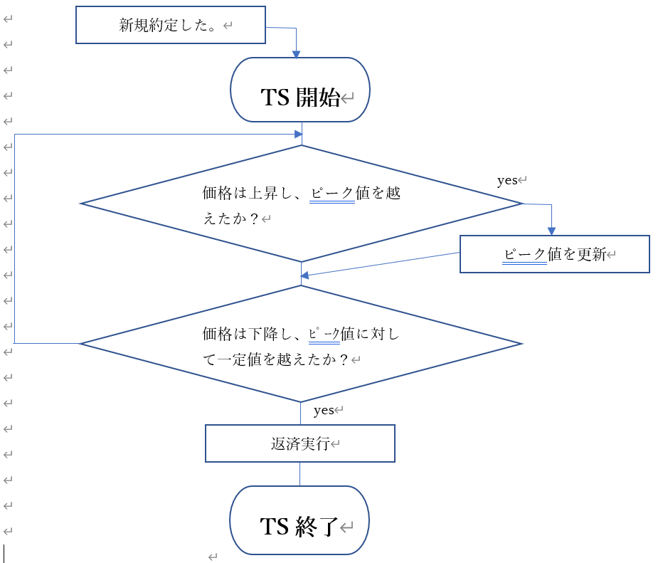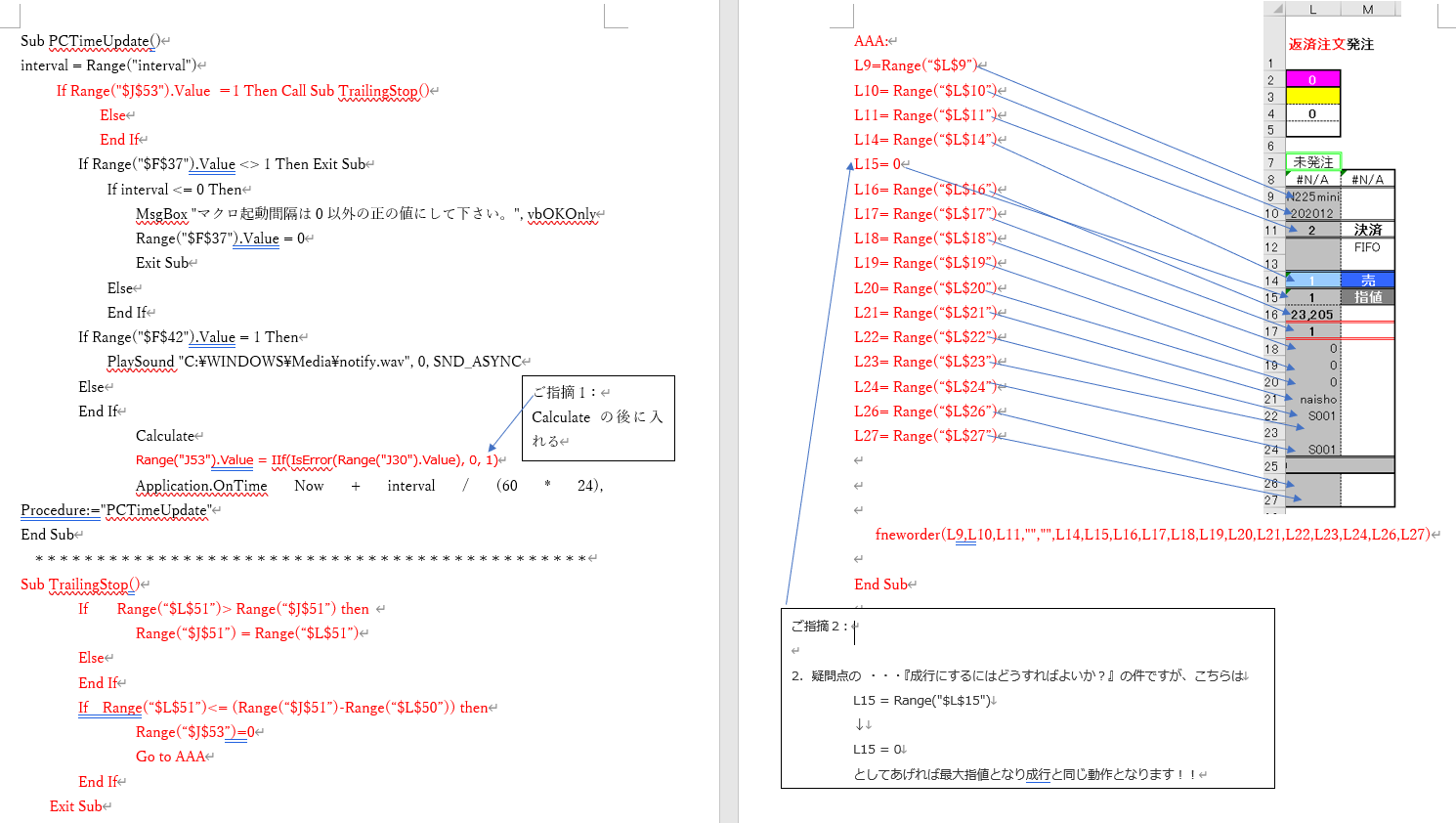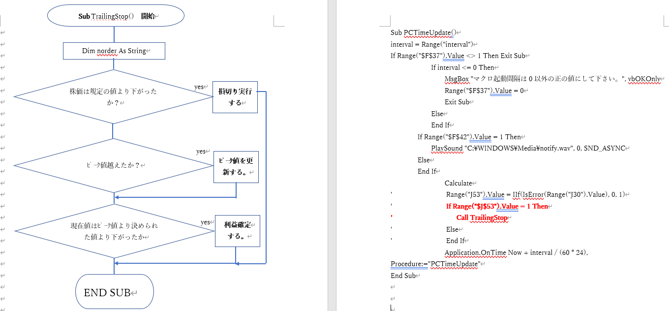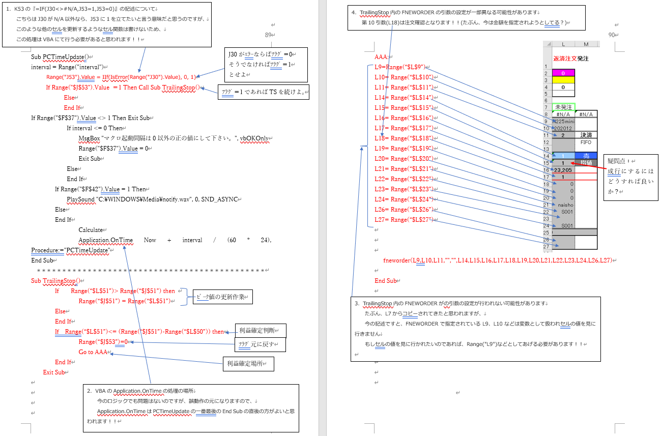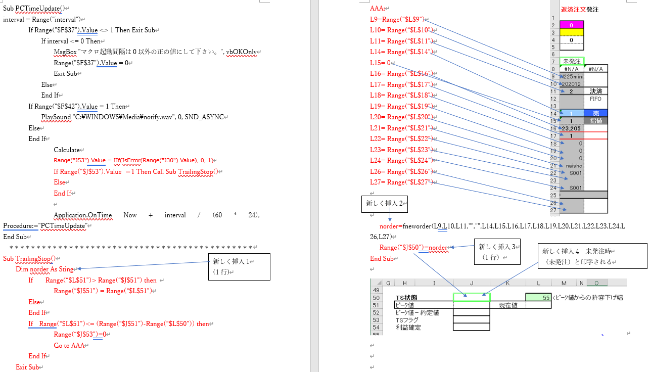 '損切り、利益確定ともそれぞれ-5000円 、5000円としています。 '済売,買とも標準モジュールに於て、 Sub 決済売() 'kessaiuri=fneworder(成行・決裁売) End Sub Sub 決済買() 'kessaiuri=fneworder(成行・決裁売) End Sub 'をそれぞれ作成しています。 '***3~25行まで保有の注文までの処理としています。