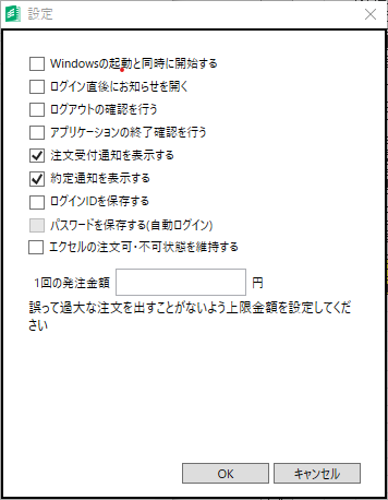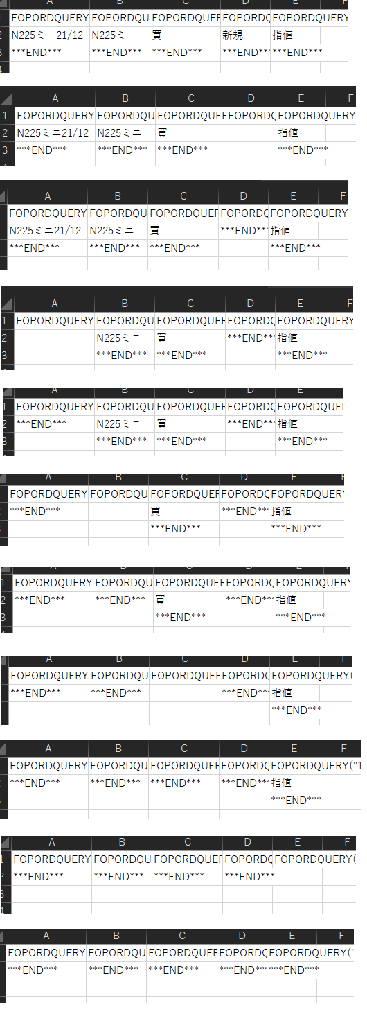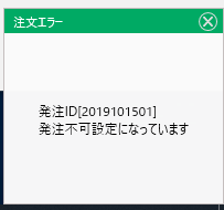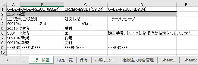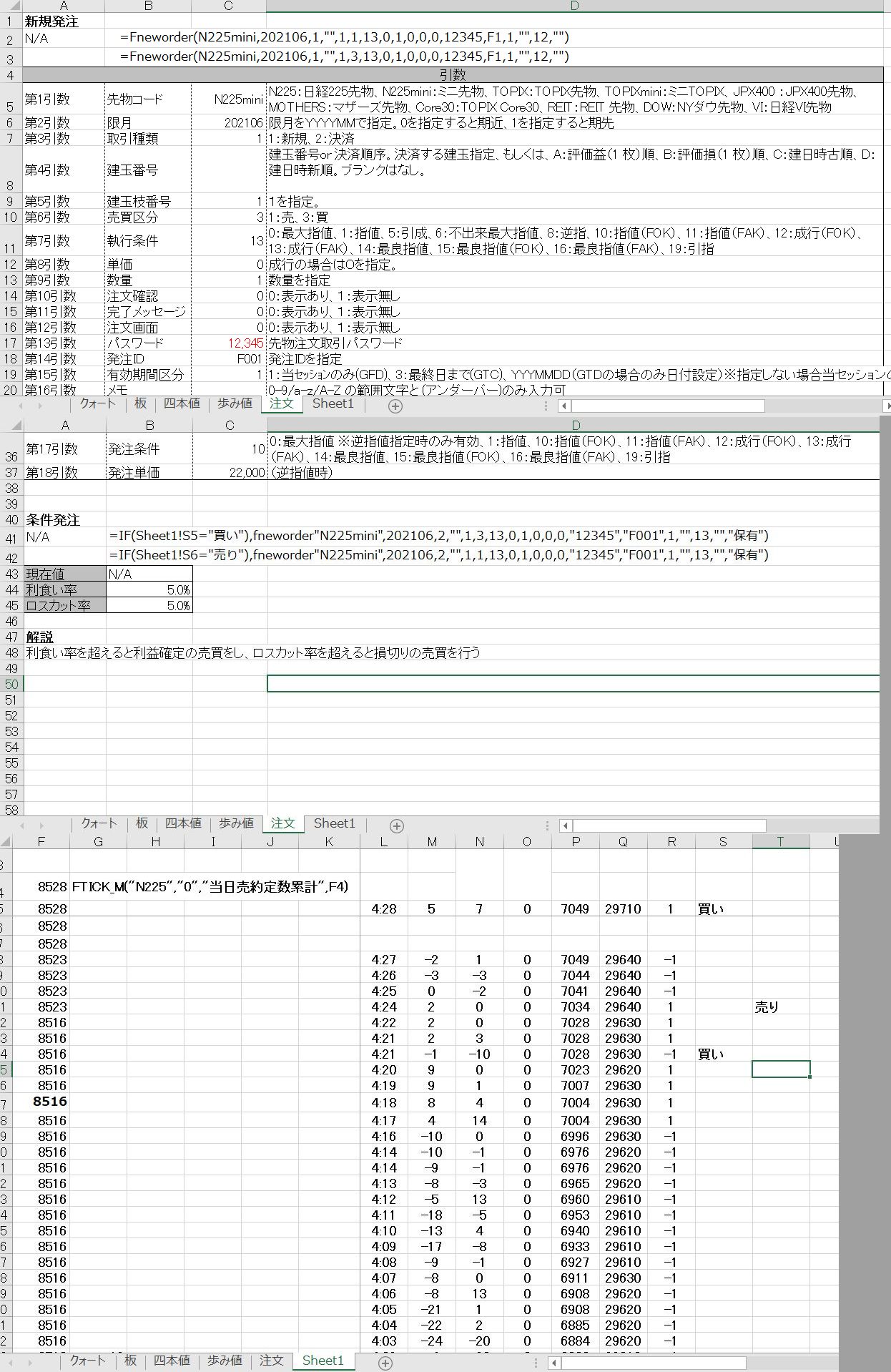 If Cells(i, 12) <> "" And Cells(i, 12) * 1 <= -5000 Or Cells(i, 12) >= 5000 Then 建玉NO = Cells(i, 10) 発注ID = Now() If Cells(i, 5) = "買" Then Call 決済売(建玉NO, 発注ID) Else Call 決済買(建玉NO, 発注ID) End If End If Next End Sub Sub 決済売(建玉NO As String, 発注ID As String) Rs = FNEWORDER("N225mini", "201706", 2, 建玉NO, "1", 1, 0, 0, 1, 0, 1, "", "password", 発注ID, 1, "trade10", "", "") End Sub Sub 決済買(建玉NO As String, 発注ID As String) Rb = FNEWORDER("N225mini", "201706", 2, 建玉NO, "1", 3, 0, 0, 1, 0, 1, "", "password", 発注ID, 1, "trade10", "", "") End Sub