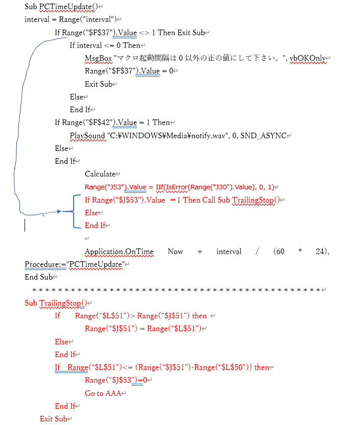 (シートモジュール) Private Sub Worksheet_Change Dim i as integer For i =3 to 25 if Cells(i,9)<=-5000 then “評価損益額はCells(3.9)から記入 if cells(i, 1)=“買" then “建玉の売買の別は,Cells(3,1)から記入 Call 決済売 Else Call 決済買 End if End if