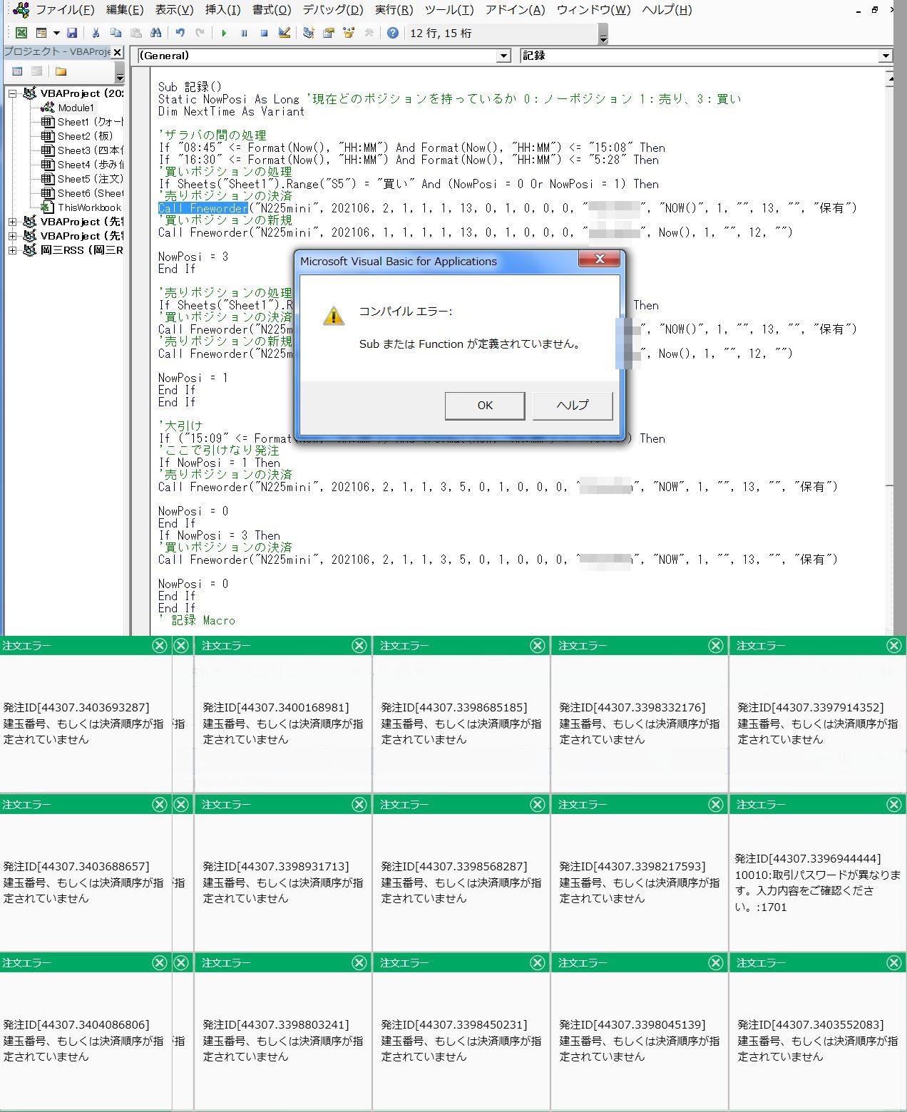 '売りポジションの処理 If Sheets("Sheet1").Range("T5") = "売り" And (NowPosi = 0 Or NowPosi = 3) Then If NowPosi = 3 Then '買いポジションの決済 Call Fneworder("N225mini", 202106, 2, "C", "", 1, 13, 0, 1, 1, 1, 1, "パスワードに変えました", OrderID, 1, "") End If