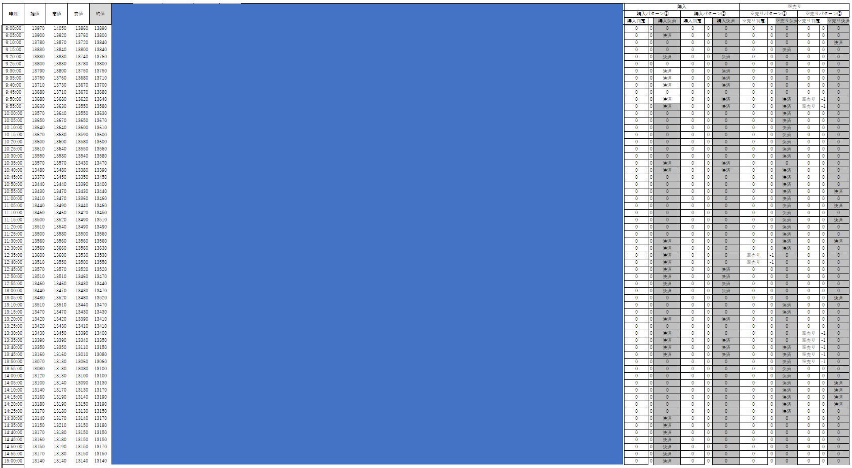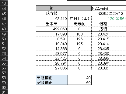 '大引け If ("15:09" <= Format(Now, "HH:MM")) And (Format(Now, "HH:MM") <= "15:14") Then 'ここで引けなり発注 If NowPosi = 1 Then '売りポジションの決済 Call FNEWORDER("N225mini", ・・・・) NowPosi = 0 End If If NowPosi = 3 Then '買いポジションの決済 Call FNEWORDER("N225mini", ・・・・) NowPosi = 0 End If End IF