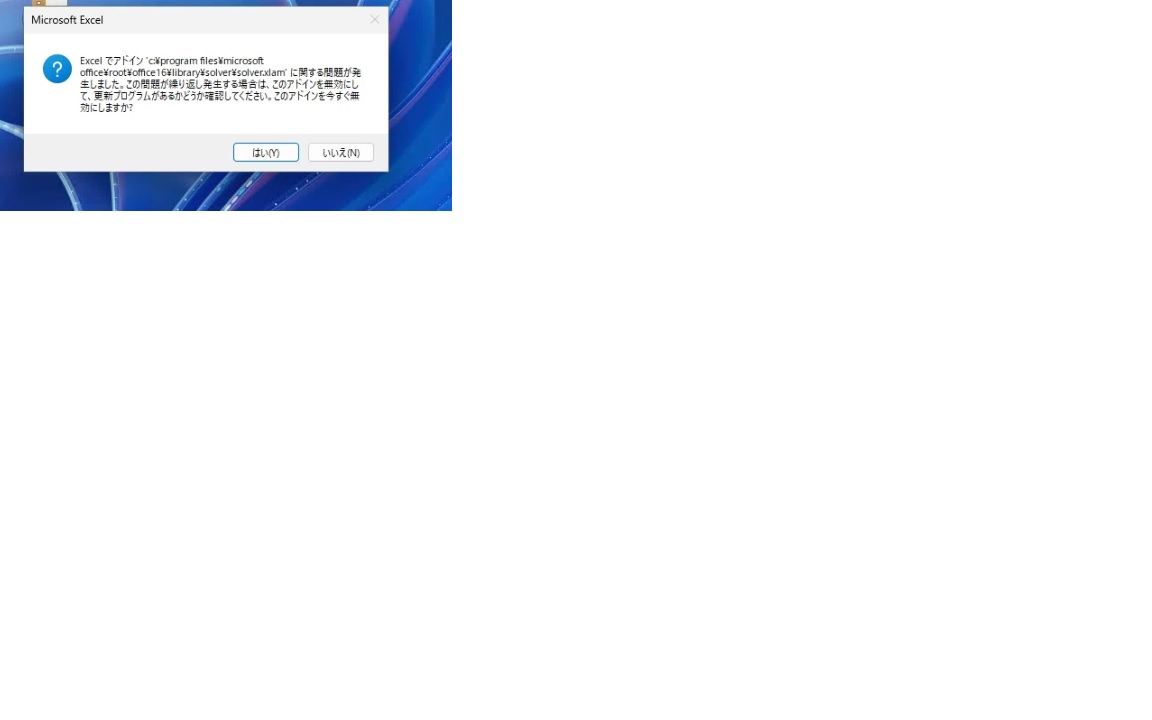 確認したところ、Excelでのアドインの設定で、「OSON COM Addion 2」というのが「無効なアプリケーションアドイン」というところに入ってしまっています。 そこで、アドイン画面の下の方の「管理」から「COMアドイン」を選択し、「使用できるアドイン」の一覧を見ましたが、「OSON COM Addin2」のチェックが外れています。 チェックを入れてOKを押しても、再度「COMアドイン」を見ると、チェックが入っていない状態です。 何度やっても「OSON COM Addin2」にチェックが入らず、「無効なアプリケーションアドイン」のところに入ったままです。