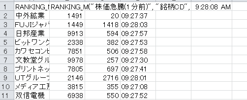 Private Sub CommandButton1_Click() 'A1に =RANKING_M("出来高","銘柄名","10",A2) といつ関数を入れてる