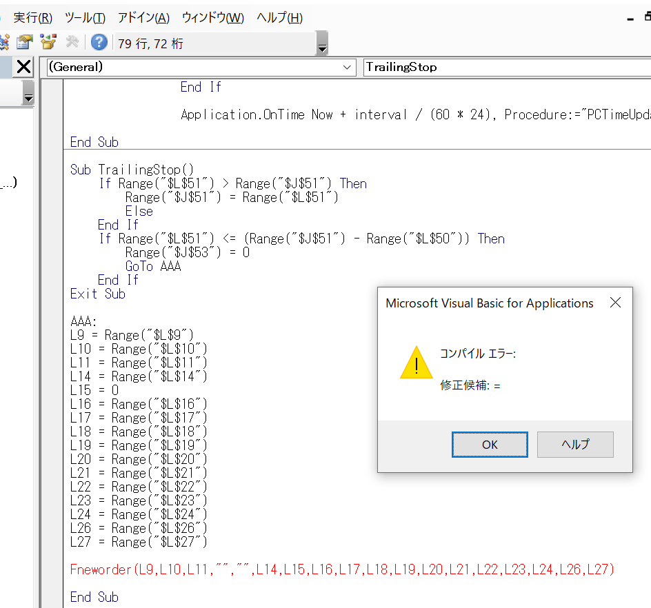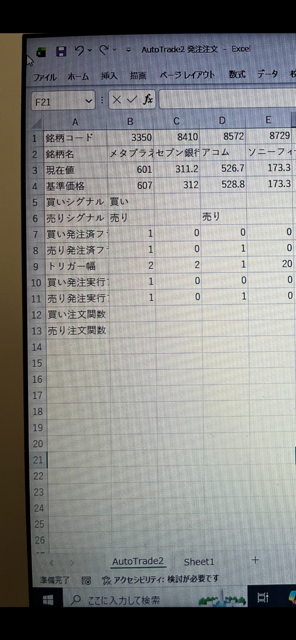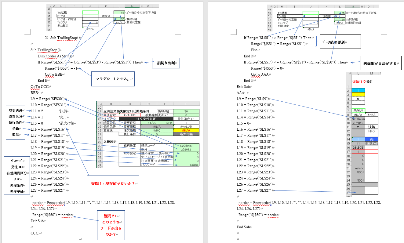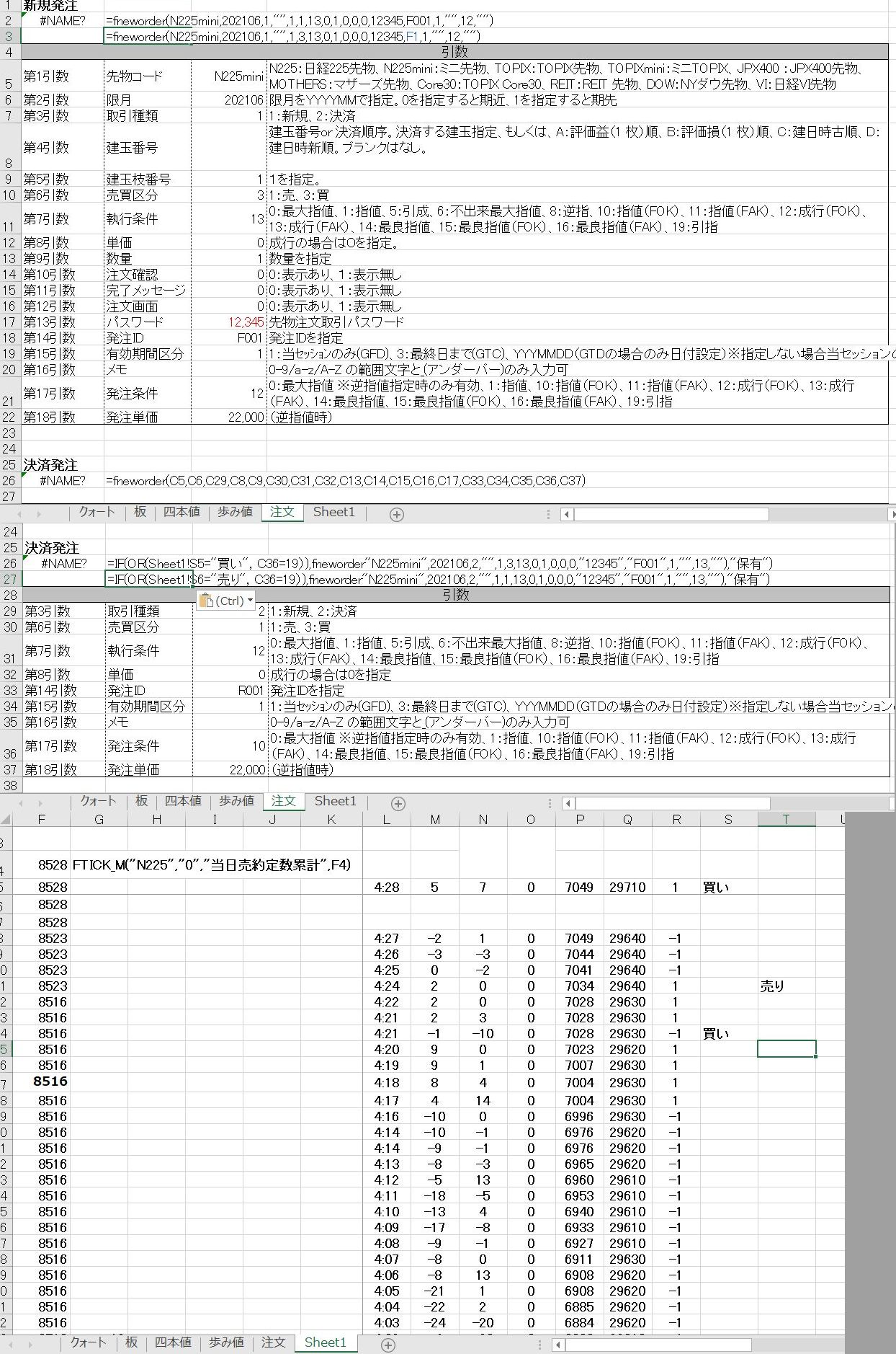 '売りポジションの処理 If sheets("Sheet1").Range("T5") = "売り" And (NowPosi = 0 or NowPosi = 3) Then '買いポジションの決済 Call FNEWORDER("N225mini", ・・・・)