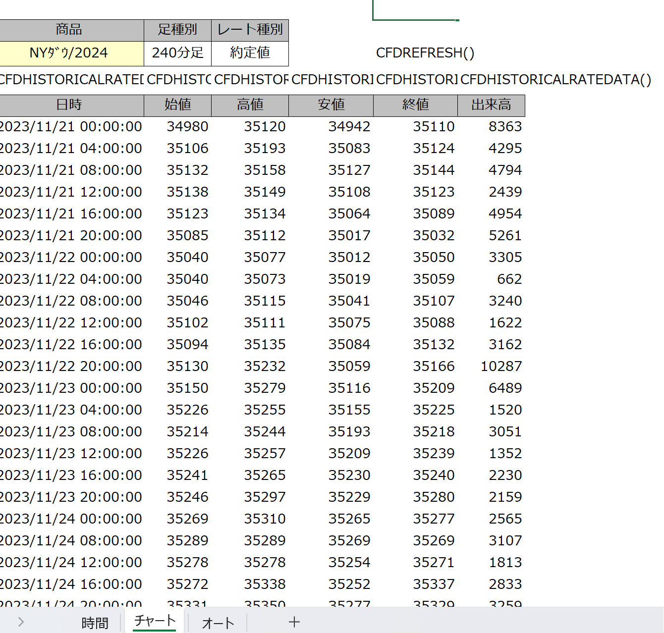 =CFDHISTORICALRATEDATAAUTO("日経 225","60 分足","買気配","60 秒","始値",A2)