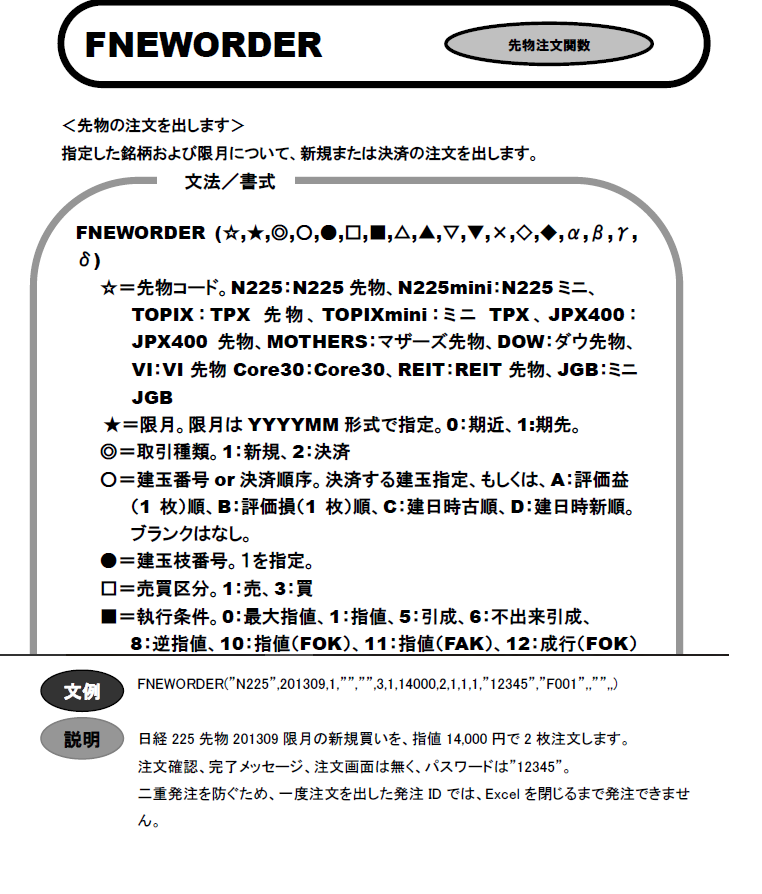Rs = FNEWORDER("N225mini", "201706", 2, 建玉NO, "1", 1, 0, 0, 1, 0, 1, "", "kkk7777", 発注ID, 1, "trade10", "", "") End Sub Sub 決済買(建玉NO As String, 発注ID As String) Dim Rb As String ’追加 Rb = FNEWORDER("N225mini", "201706", 2, 建玉NO, "1", 3, 0, 0, 1, 0, 1, "", "kkk7777", 発注ID, 1, "trade10", "", "") End Sub
