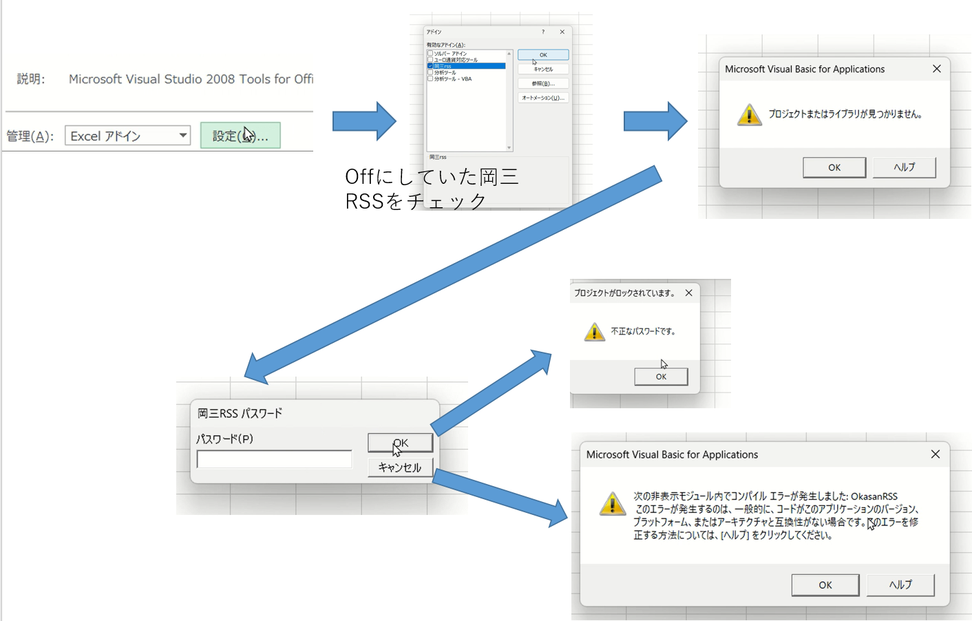 それとエクセルアドイン確認してみてアクティブなアドインアクティブでないを両方みても岡三RSSは表示されてません。 oson com addin 2はアクティブで表示されていてエクセルでもチェック入ってます。