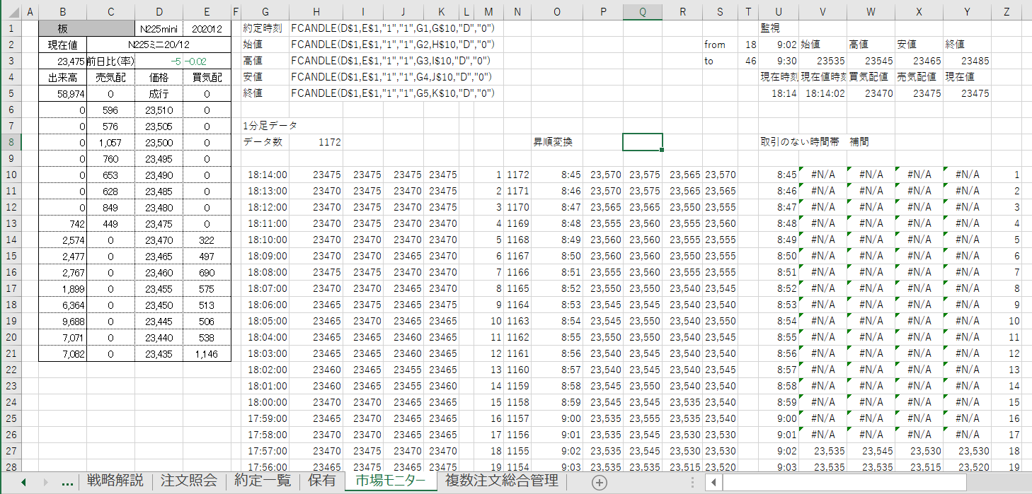 'ザラバの間の処理 If "08:45" <= Format(Now(), "HH:MM") And Format(Now(), "HH:MM") <= "15:08" Then '買いポジションの処理 If sheets("Sheet1").Range("S5") = "買い" And (NowPosi = 0 or NowPosi = 1) Then '売りポジションの決済 Call FNEWORDER("N225mini", ・・・・)