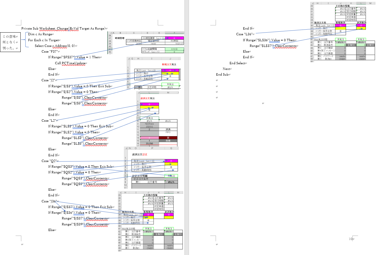 小笠原聖史 様 早速のご回答お礼申し上げます。 新規買いの発注マクロを詳細にお教え頂き有難うございます。FOPPOS10Nの評価損益額にてCOCを行いたく考えていますが,主題のシートモジュールに記したPrivate sub worksheet changeの中の“call 決済売“ で呼び出される“sub 決済売() “の建玉番号を記入するところが良く分かりません。 できましたら,下記の**を追加したPrivate Sub Worksheet_Change()及びsub 決済売() をチェック願えれば、幸甚でございます。 なお、FOPPOS1T10Nは、sheet6(決済)で開いています。 (前回の問い合せ時のコードからは修正しています)