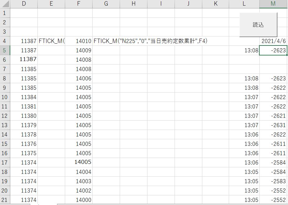 大野様 ありがとうございました。早速一部分ですが実験してみました! ところで、QUOTE_Mは、シート1のD列に、縦に約8000行書き込まれております。 したがいまして、削除するのは、Range(Cells(1,4),Cells(8000,4)).clearでOKと思いますが、再度書き込むのは、 For i=1 to 8000 Cells(I,4)=”QUOTE_M(Cells(I,1),””,”現値”)” (Cells(I,1)=銘柄コード) Next I となるのでしょうか?(コンパイルエラーでOKとなりませんでした!) この書き込み方を教えていただければありがたいです。 更に、書き込むのに相応な時間がかかりそうですが、他に高速で書き込む方法(出来れば数秒で)はあるでしょうか? 以上よろしくお願いいたします。