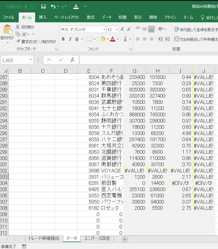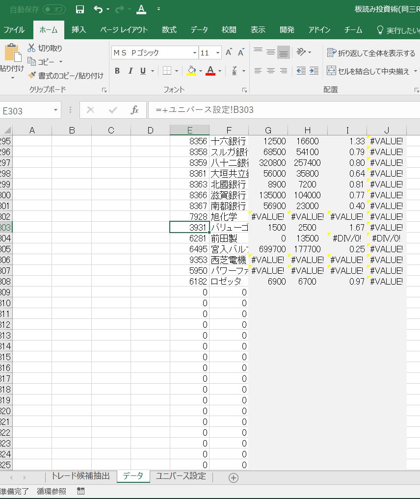 ユニバースの301行目のコードと銘柄名を入れ替えてみたところ、データシートの方で#VALUE!が出てきました。