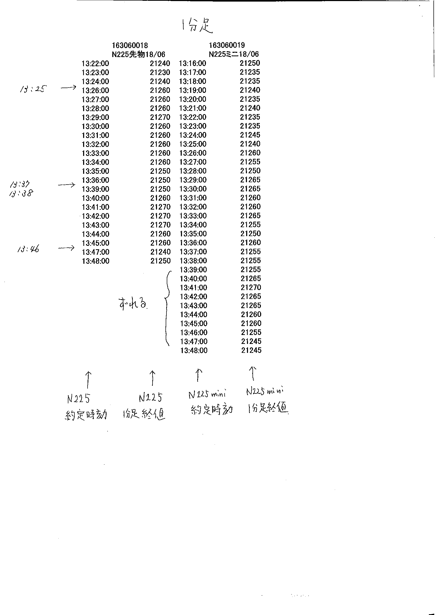 N225とN225mini 1分足を並べて表示した場合に行がずれる