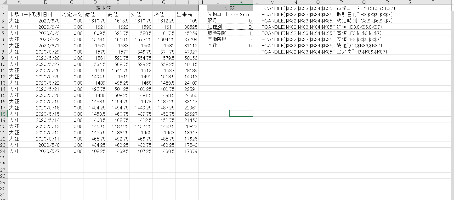 4日の22時頃エクセルを開きデータを取得し始めた段階から日付が5日になり、始値が反映されてしまています。(5日の始値は4日の22時頃の価格)