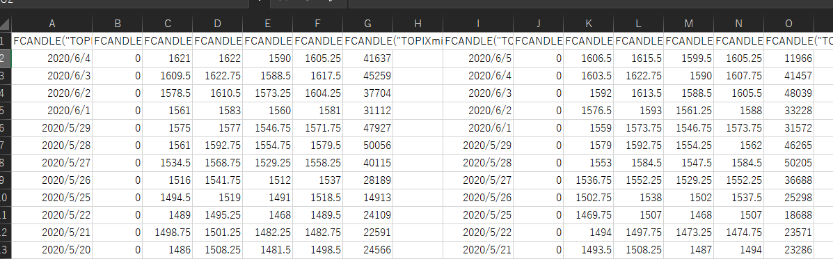 4行目以降は、営業日のデータとしてちゃんとFCANDLEが取得できているんだけど、