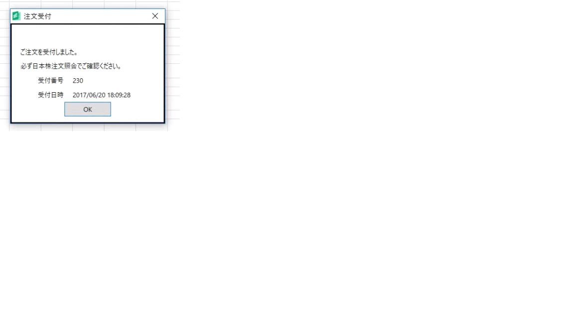 岡三RSSの発注について、VBAプログラムから直接買い注文(現物、成行)を出したところ、