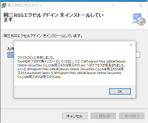 岡三RSSをインストールしようとすると、添付画像にある「岡三RSS.xlaへのアクセスが拒否されました」と言うエラーがでて中断されます。