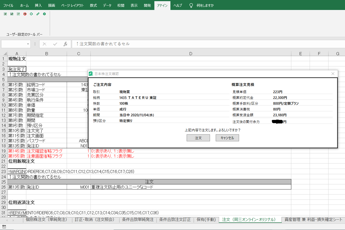 ・Excel2019を立ち上げて(例えば「日本株注文.xlsx」で)シンプルに現物株注文